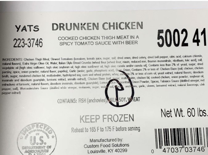 El pollo está identificado como “Yats Drunken Chicken Cooked Chicken Thigh Meat In A Spicy Tomato Sauce With Beer” y se distribuyó en cajas de 60 libras que contenían 12 bolsas de 5 libras.