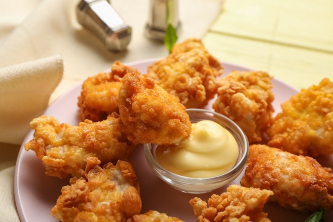 Dedos de mozzarella, palomitas de pollo y papas con queso y tocino, tres platos para disfrutar el día de gran juego. Crédito: Shutterstock