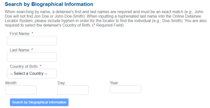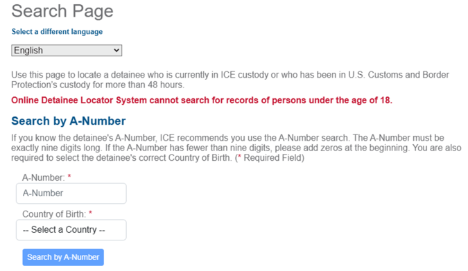 Con el A#, se puede utilizar el localizador en línea de ICE, accesible en locator.ice.gov/odls/#/search. Este sistema permite buscar a la persona detenida ingresando su A# y país de nacimiento.