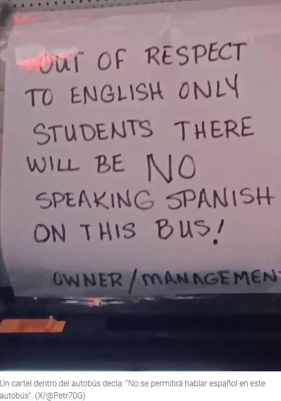 “Por respeto a los estudiantes que solo hablan inglés, ¡NO se permitirá hablar español en este autobús!”, rezaba el cartel colocado en la unidad educativa por parte del conductor, reseña la agencia de noticias EFE.