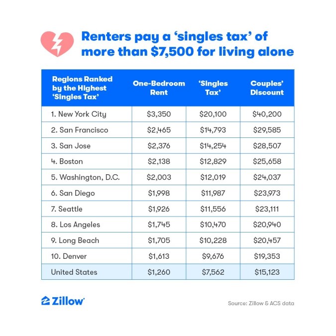 Según un nuevo análisis de Zillow Rentals, el “impuesto para solteros” -la cantidad adicional que pagan los inquilinos solteros por un apartamento de una habitación en comparación con compartir el alquiler con compañeros de habitación o parejas- se ha disparado a un récord de $7,562 dólares.