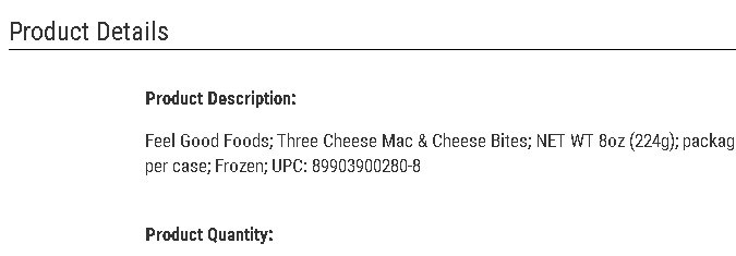 En cuanto al empaque, la FDA revela que es un producto de Feel Good Foods del tipo bocados de macarrones con queso y tres quesos congelados, envasado en cartón amarillo con 9 unidades por caja y la UPC 89903900280-8.