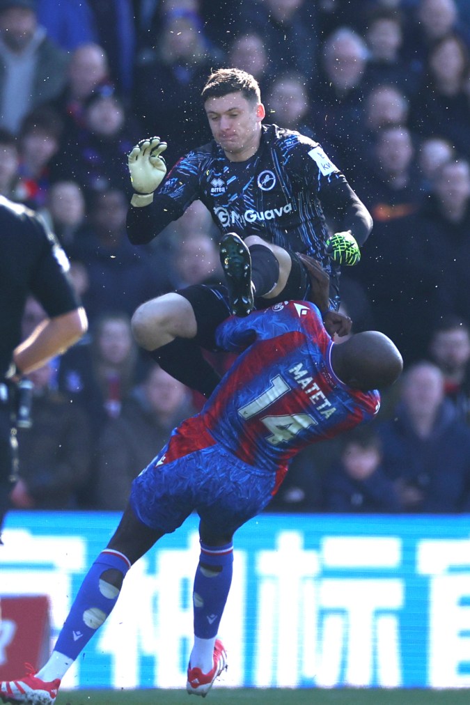 La acción se desarrolló cuando recién se daban las primeras acciones de este juego. Un pelotazo largo a la espalda de Jake Cooper encontró al atacante del Palace atento. Mateta quedó mejor posicionado que el defensor y cuando fue a ganarle el espacio, sintió un virulento impacto.