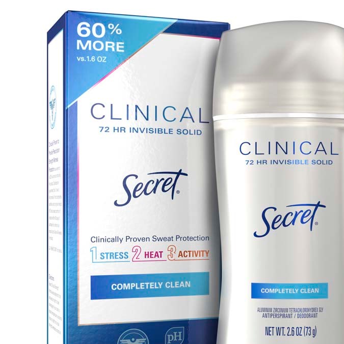 - El Secret Clinical Antiperspirant proporciona 72 horas de protección clínicamente probada contra el mal olor y el sudor, contra tres tipos de sudor: estrés, calor y actividad.
