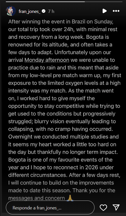 La británica actualizó su estado de salud mediante una historia en su cuenta de Instagram, donde informó las causas de lo sucedido: “Después de ganar el evento en Brasil el domingo, nuestro viaje total duró más de 24 horas, con un mínimo de descanso y recuperación de una larga semana. Bogotá es famosa por su altitud y a menudo tarda unos días en adaptarse”.