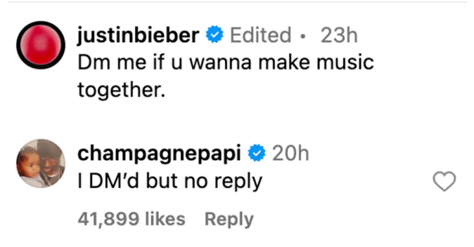 Justin Bieber generó revuelo esta semana en redes sociales tras publicar una invitación abierta a colaborar musicalmente, que incluyó una respuesta del también canadiense Drake, quien afirmó no haber recibido contestación a su mensaje.