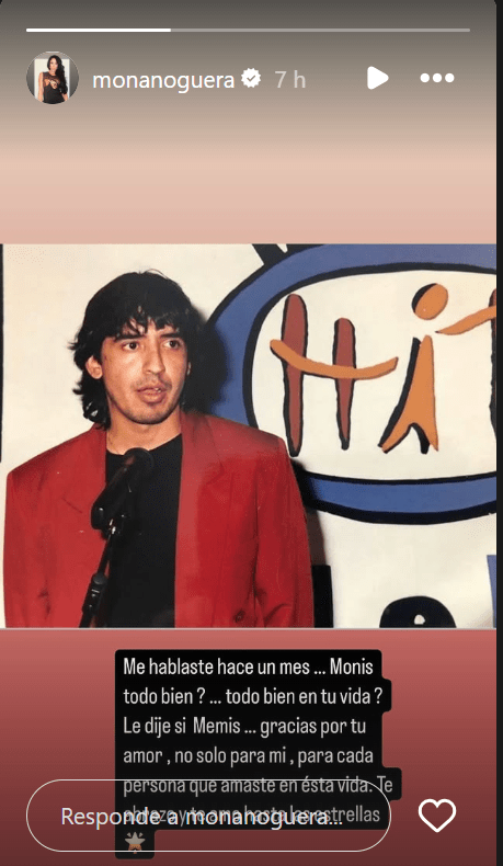 “Me hablaste hace un mes … Monis todo bien?… todo bien en tu vida? Le dije sí Memis”, destaca el mensaje de Mónica Noguera recordando una de sus últimas conversaciones con Memo del Bosque.
