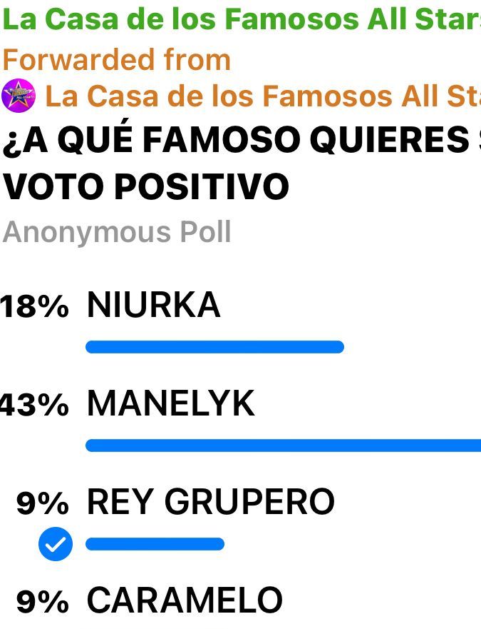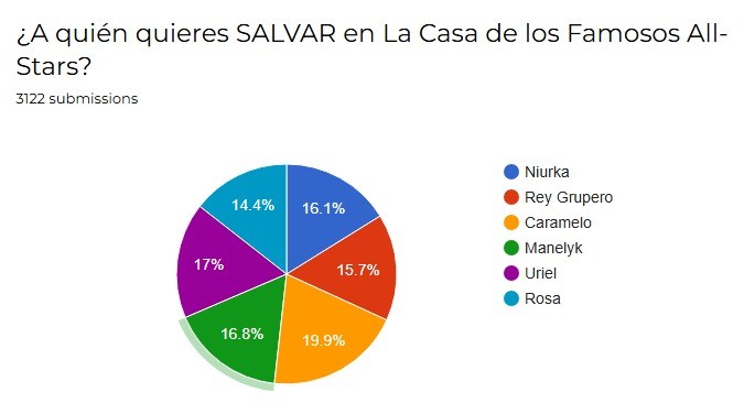 En Telegram, por otra parte, contamos con una gráfica diferente. Ahí, tanto Rey como Caramelo, Uriel y Rosa son los únicos que van bajos en votos, con un 9 % por ciento cada uno. Manelyk y Niurka Marcos son las únicas que parecen fuera de peligro dentro de dicha encuesta.