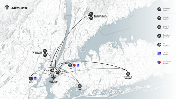 Archer planea utilizar infraestructura aeroportuaria existente, como helipuertos y espacios ya adaptados al tráfico aéreo, para establecer vertipuertos (zonas dedicadas al despegue y aterrizaje de aeronaves eVTOL). Estos puntos estratégicos estarán distribuidos en el área metropolitana, facilitando el acceso a los aeropuertos y zonas comerciales clave.
