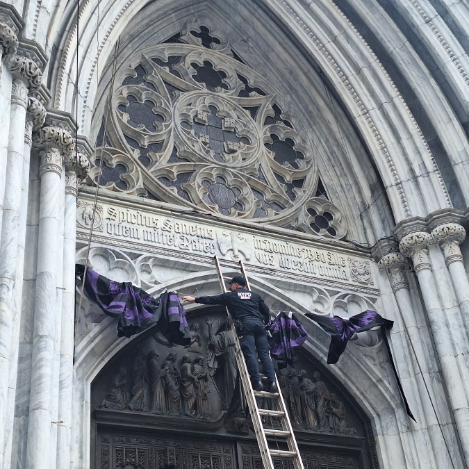 En la entrada principal de la iglesia, el Departamento de Policía de la Ciudad de Nueva York (NYPD) ayudó a instalar unas gigantescas cintas moradas y negras, como señal de luto.