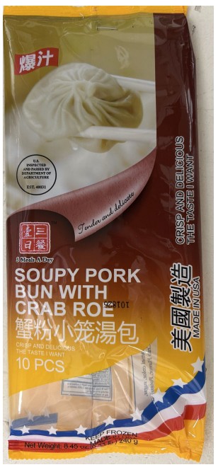 “BOLLO DE CERDO CON SOPA Y HUEVAS DE CANGREJO 3 comidas al día”: en su presentación de bandeja de manga de 8,45 oz de con los códigos de lote: 052625-090626, impreso en el empaque.