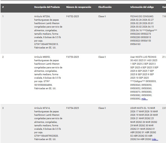 - 7,929 cajas de Hamburguesas de papas hashbrown de Lamb Weston, artículo M7422: en su presentación papas congelada, de forma ovalada en 6 bolsas de 3,5 lb por caja, GTIN 10044979923813, fabricado en EE. UU.. Los productos tienen los códigos: 09502263, 09502273, 09502283, 09503013, 09503023, 09504153, 09504163 y fechas de consumo: 26/02/2026, 27/02/2026, 28/02/2026, 01/03/2026, 02/03/2026, 15/04/2026, 16/04/2026.