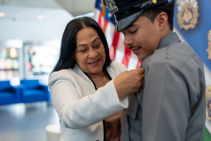 El nuevo oficial es uno de los 30 de origen dominicano que se integran a las filas de NYPD. Aqui en la gráfica acompañado por Leandra Guzmán Feliz, la madre de "Junior". Crédito: NYPDCommAffairs | Cortesía