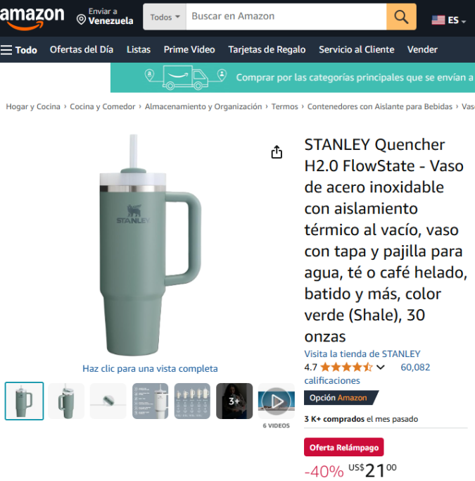“El vaso FlowState H2.0 te mantiene hidratado con menos recargas. El aislamiento térmico al vacío de doble pared significa que las bebidas permanecen frías, heladas o calientes durante horas. Elige entre nuestras opciones de 14 onzas, 20 onzas, 30 onzas, 40 onzas y 64 onzas”, destaca Amazon.
