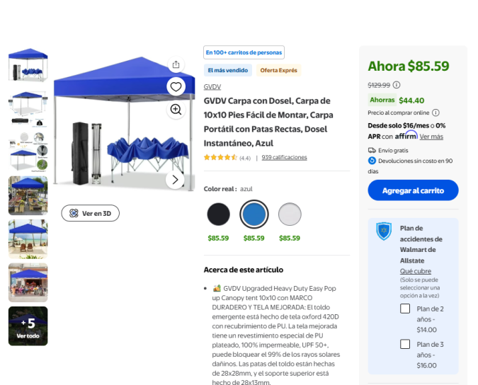 “La cobertura de sombra de este toldo es de 10 x 10 pies y puede acomodar 4 mesas o 7-8 personas al mismo tiempo. Este toldo es adecuado para jardín de casa, área de juegos, patios, playas, áreas comerciales, grandes gimnasios, áreas de construcción, áreas de ayuda en desastres y más”, reza parte de la descripción del producto de Walmart.