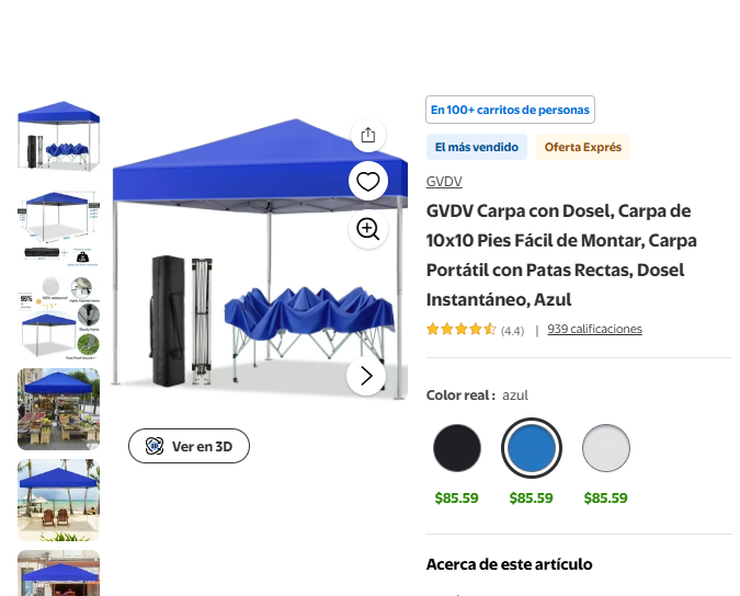 “La cobertura de sombra de este toldo es de 10 x 10 pies y puede acomodar 4 mesas o 7-8 personas al mismo tiempo. Este toldo es adecuado para jardín de casa, área de juegos, patios, playas, áreas comerciales, grandes gimnasios, áreas de construcción, áreas de ayuda en desastres y más”, reza parte de la descripción del producto de Walmart.