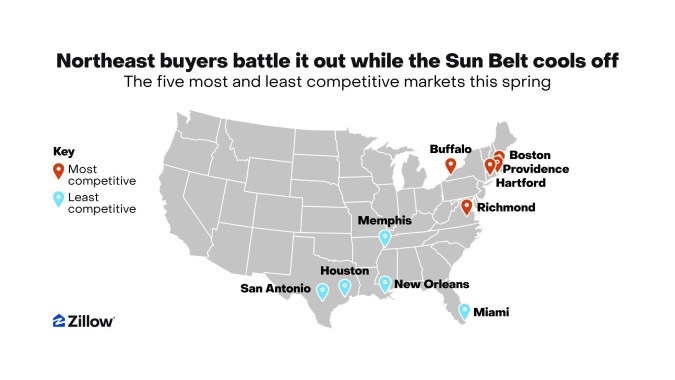 Llegó la temporada de compras de vivienda, y la experiencia puede ser muy diferente para quienes buscan casa en Boston que para quienes buscan en Miami. Un nuevo análisis de Zillow muestra que los compradores desde Buffalo hasta Boston se enfrentan a al menos 10 competidores por cada vivienda, mientras que quienes buscan en el Cinturón del Sol probablemente tengan más margen de negociación.