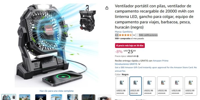 Este ventilador no solo está disponible en negro. Amazon ofrece el mismo modelo en verde, azul, rosa, naranja y amarillo, con ligeras variaciones de precio. Con más de 946 valoraciones y un promedio de 4.5 estrellas, es una opción confiable para quienes buscan frescura y funcionalidad en un solo dispositivo.