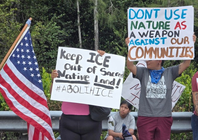 Entre los lemas más visibles destacaban: “ICE, ¡fuera de nuestras tierras sagradas!” y “No usen la naturaleza como arma contra nuestras comunidades”.