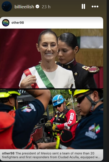 A través de una historia en Instagram, la cantante pop compartió un post de Other89, que destacaba el gesto de la presidenta de México por enviar ayuda a Texas, a pesar de las recientes tensiones con el presidente Donald Trump.