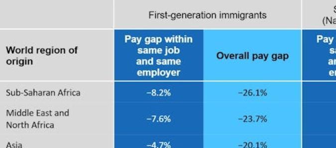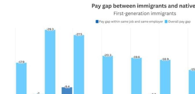 Un estudio realizado por nature.com asegura que los salarios de los inmigrantes en Europa y Norteamérica son casi un 18% más bajos que las de los nativos de estos países. La investigación analizó los salarios de 13.5 millones de personas en nueve países: Canadá, Dinamarca, Francia, Alemania, Países Bajos, Noruega, España, Suecia y Estados Unidos entre 2016 y 2019.