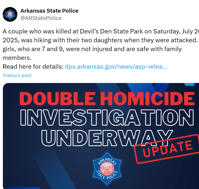 Shea Lewis, Secretario del Departamento de Parques, Patrimonio y Turismo de Arkansas, expresó su pesar por los trágicos sucesos: “Estamos profundamente consternados por los hechos ocurridos en el Parque Estatal Devil’s Den. Nuestros pensamientos están con los seres queridos de las víctimas. La seguridad de nuestros visitantes y personal es nuestra máxima prioridad, y estamos trabajando estrechamente con la Policía Estatal de Arkansas y otras agencias para resolver este crimen”, dijo Lewis.