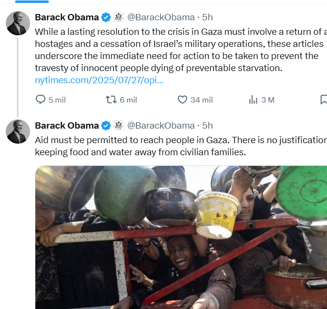 Obama pide acción urgente para evitar hambruna en Gaza, mientras Netanyahu defiende la entrada limitada de ayuda humanitaria y Trump acusa a Hamas de robarla