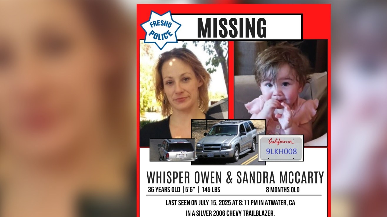 Whisper Owen, de 36 años y Sandra McCarty, de 8 meses fueron vistas por última vez a mediados del mes de julio cuando, la mujer viajó hacia Sacramento para una cita médica. Imágenes de videos de vigilancia vieron pasar el vehículo que conduce, una SUV gris en la autopista 120 al este de Escalon.