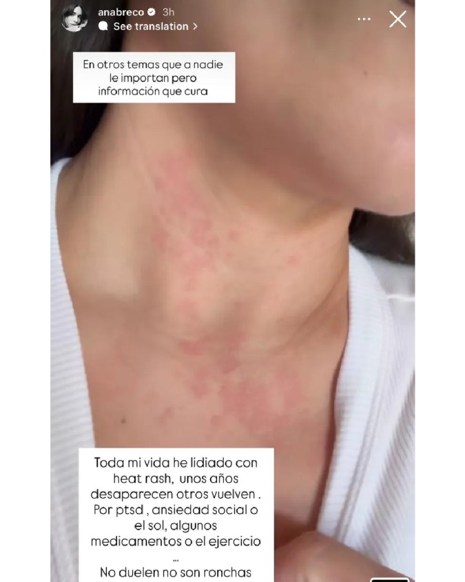 En una serie de publicaciones en sus Instagram Stories, la protagonista de telenovelas mostró un par de fotografías de una curiosa erupción en la piel, principalmente en la zona de su cuello, donde confesó que el brote no es nuevo en su vida, pero sí se ha intensificado desde el nacimiento de la pequeña.