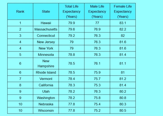 Hawaii lidera con 79.9 años y Mississippi es el último, con casi 10 años menos en promedio. En el área triestatal, Connecticut fue el estado mejor posicionado, ocupando el 3er puesto del país, con una expectativa de vida promedio de 79.2 años: 76.3 para hombres y 82 para mujeres.