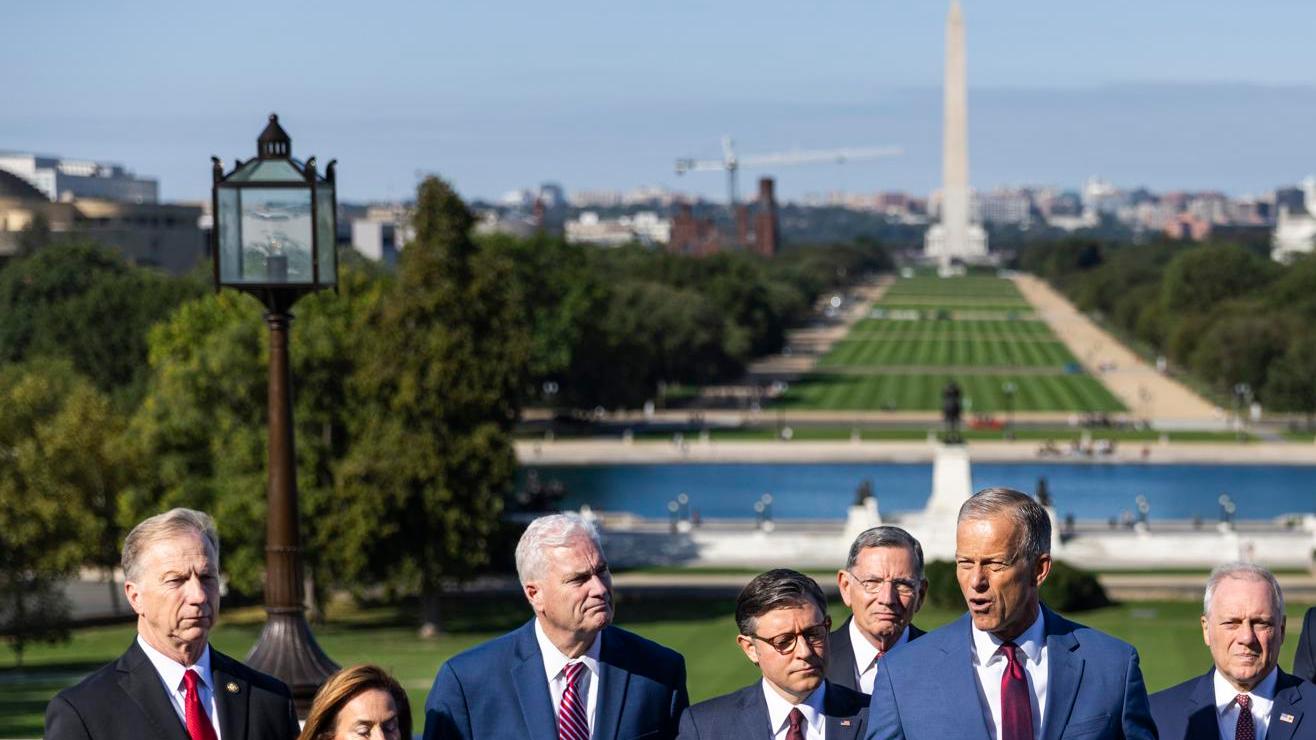 Los líderes republicanos de la Cámara de Representantes y el Senado de EE. UU., incluyendo al presidente de la Cámara de Representantes, Mike Johnson (CL), y al líder de la mayoría del Senado, John Thune (C), hablan con los medios sobre el cierre del gobierno desde el Capitolio de EE. UU. en Washington, D.C., EE. UU., el 1 de octubre de 2025. Crédito: /EPA/JIM LO SCALZO | EFE