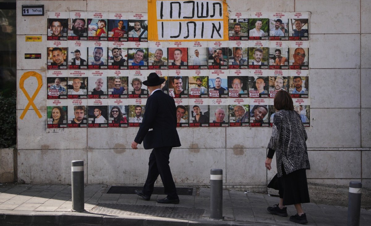 Personas observan fotos de rehenes retenidos por Hamás en Gaza. Crédito: Ohad Zwigenberg | AP