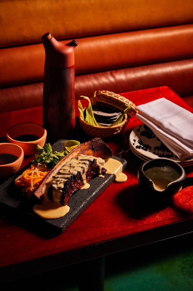 Pero quizás el plato más teatral y fotografiado hasta ahora sea la Long-Bone Short Rib Quesabirria, una costilla de birria servida con queso fundido y un consomé de res picante, que el mesero vierte en la mesa. Acompañado de tortillas de maíz azul, el comensal puede armar sus propios tacos y sumergirlos en el caldo, al más puro estilo de la birria callejera mexicana, pero elevada a un nivel gourmet.