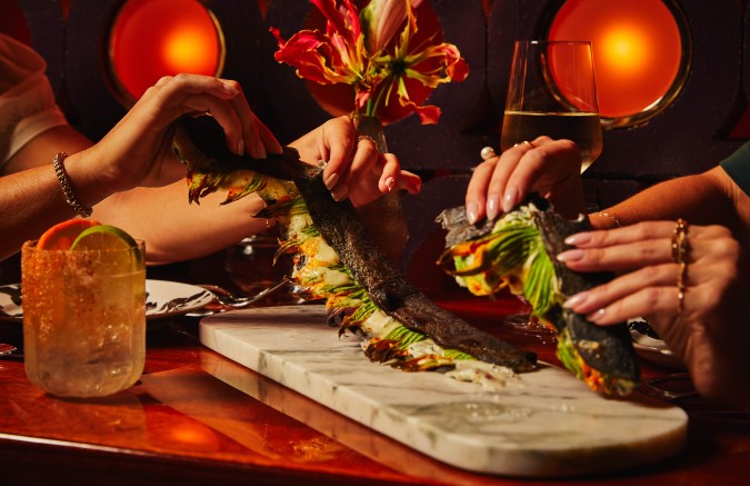 Entre los platillos estrella se encuentran los Machetes, tortillas largas rellenas de queso Oaxaca y flor de calabaza o de trufa y guayaba, una creación que juega con texturas y contrastes dulces y salados. También destacan los Solteros, una versión sofisticada de los nachos, servidos como pequeñas joyas individuales con coberturas que van desde langosta con maíz de Montauk hasta barbacoa de res. Otro plato que roba cámara es la Lobster al Pastor, una langosta bañada en mantequilla de achiote y chile, acompañada de crema de aguacate, una combinación que rinde homenaje al icónico taco al pastor con un giro marino y elegante.