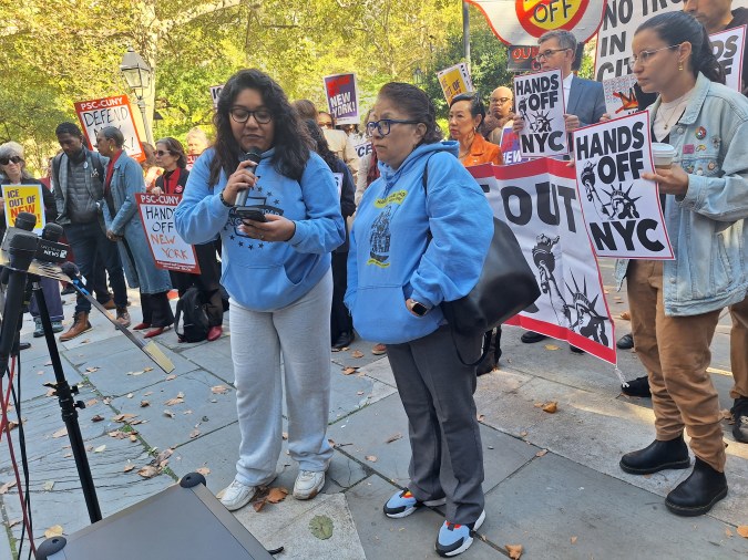 “En lugar de invertir en escuelas, hospitales y servicios públicos, se gasta el dinero de los contribuyentes en enviar tropas de la Guardia Nacional y agentes del Servicios de Inmigración y Aduanas (ICE) a nuestras comunidades, separando familias y atacando a la gente trabajadora”, resaltó Donna Liebermann, portavoz de la Unión de Libertades Civiles de Nueva York (NYLCU), al frente de la sede de la Alcaldía en el Bajo Manhattan.