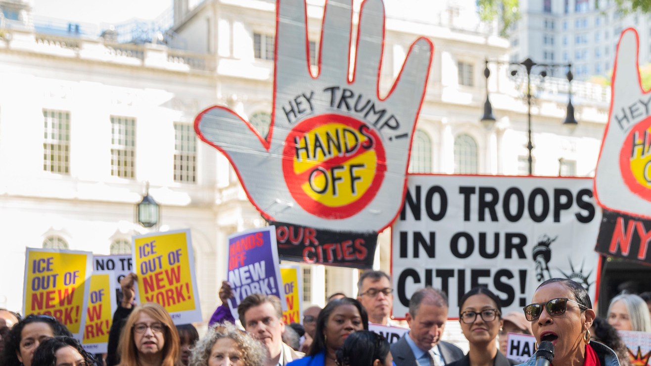 “En lugar de invertir en escuelas, hospitales y servicios públicos, se gasta el dinero de los contribuyentes en enviar tropas de la Guardia Nacional y agentes del Servicios de Inmigración y Aduanas (ICE) a nuestras comunidades, separando familias y atacando a la gente trabajadora”, resaltó Donna Liebermann, portavoz de la Unión de Libertades Civiles de Nueva York (NYLCU), al frente de la sede de la Alcaldía en el Bajo Manhattan.