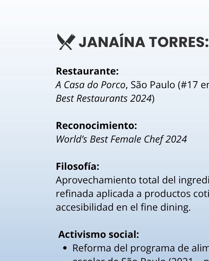 “Durante mucho tiempo, la gastronomía latinoamericana fue vista como simple, cuando en realidad es una de las más sofisticadas del mundo. A las jóvenes chefs les diría: no dejen que nadie les diga qué califica o no como fine dining. Nuestra tradición tiene técnica, historia y poder; eso es lo que el mundo necesita ver”.