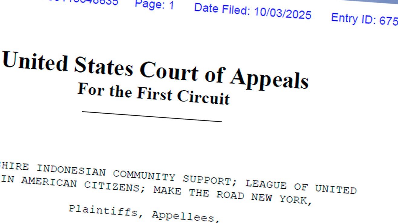 En el caso New Hampshire Indonesian Community Support versus Donald J. Trump, los jueces de apelaciones confirmaron la determinación del juez Laplante, luego de una demanda presentada por la Unión Estadounidense por las Libertades Civiles (ACLU), la ACLU de New Hampshire, la ACLU de Maine, la ACLU de Massachusetts, Asian Law Caucus, el Fondo de Defensores de la Democracia y el Fondo de Defensa Legal en nombre de New Hampshire Indonesian Community Support, la Liga de Ciudadanos Latinoamericanos Unidos (LULAC) y Make the Road New York.