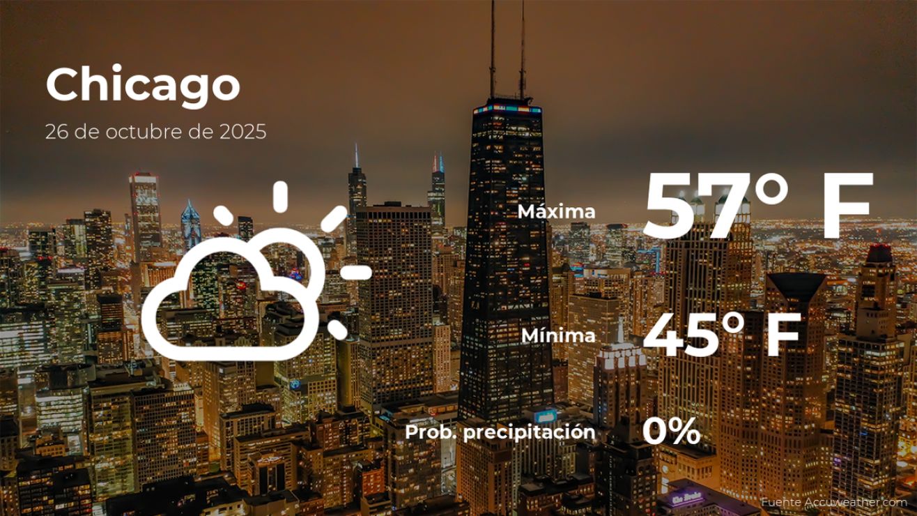 Conoce cómo estará el tiempo en Chicago, para hoy domingo 26 de octubre. Antes de salir de tu casa, descubre el pronóstico meteorológico y las condiciones climáticas más relevantes para este día.