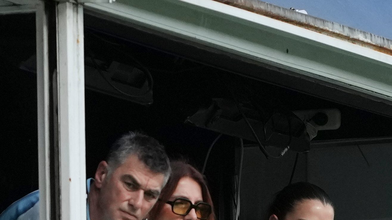 Dua Lipa, en el centro, asiste a un partido de la liga de fútbol argentina entre Boca Juniors y River Plate en Buenos Aires, Argentina, el domingo 9 de noviembre de 2025. Crédito: Natacha Pisarenko | AP