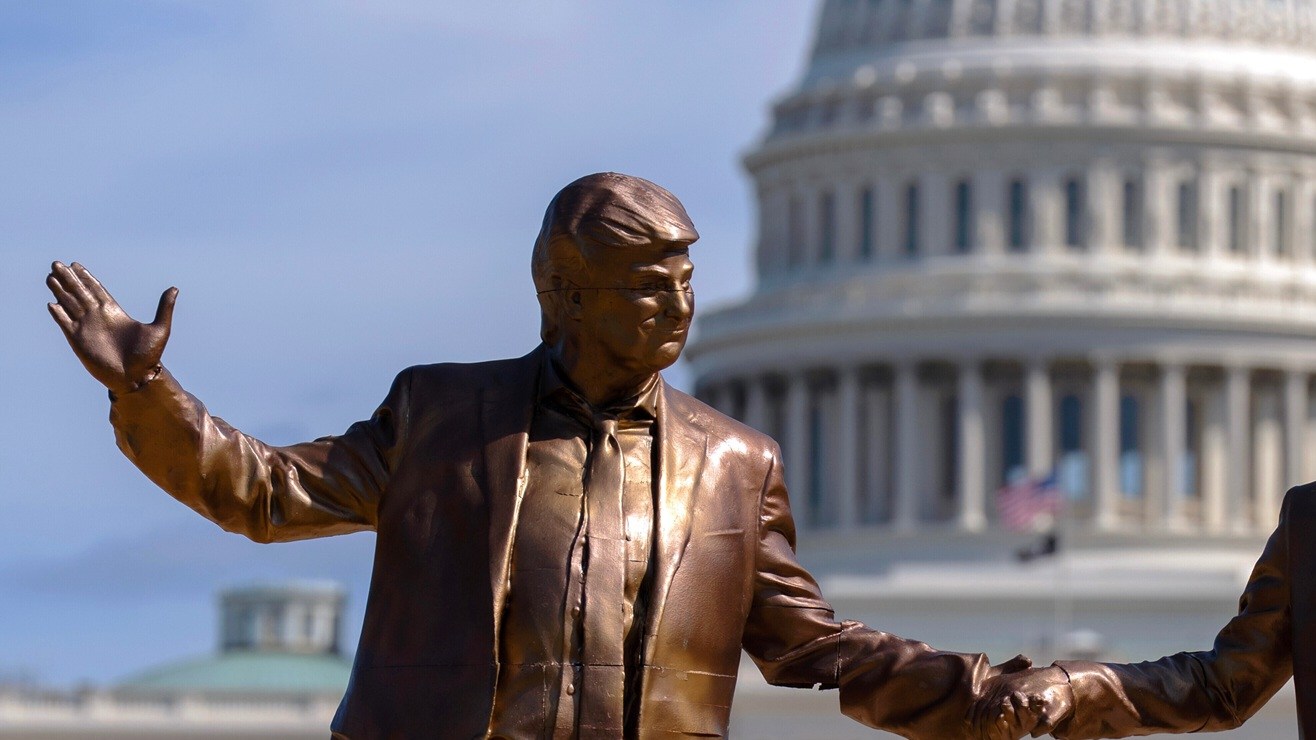 Una instalación artística que representa al presidente Trump y a Epstein en el National Mall, cerca del Capitolio. Crédito: Jose Luis Magana, File | AP