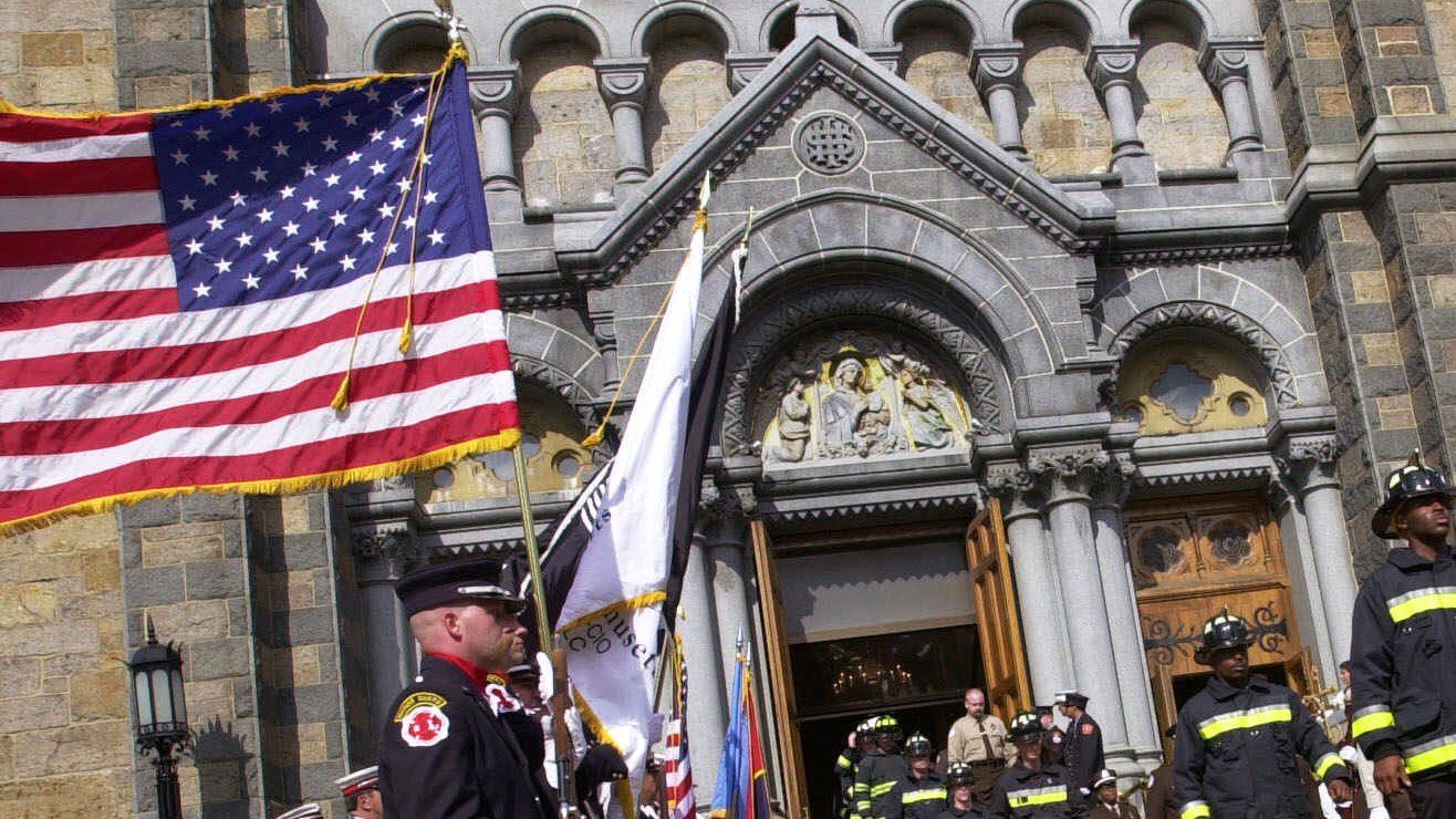 Bomberos de Massachusetts y Nueva York salen de la Iglesia de la Misión tras un servicio religioso en memoria de su compañero Manuel DelValle, el 19 de septiembre de 2001. Crédito: Elise Amendola | AP