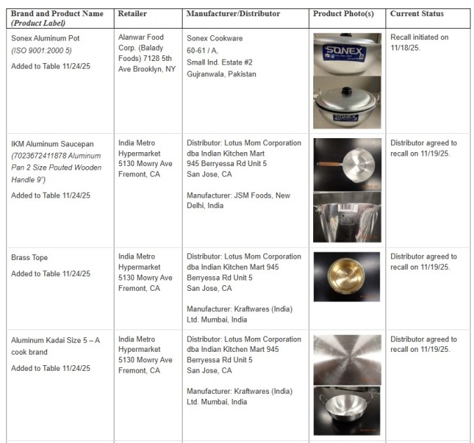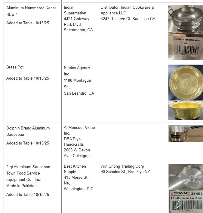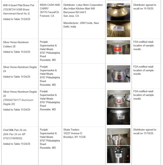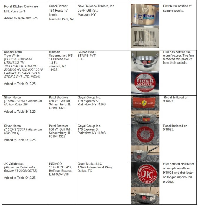 Un reporte de la Administración de Alimentos y Medicamentos (FDA) notificó los lugares donde se vendieron utensilios de cocina calificados como riesgosos para la salud porque podrían filtrar plomo a los alimentos, entre ellos 3 en Nueva York y uno en Nueva Jersey. Específicamente, se trata de ollas Sonex y recipientes para la leche en dos tiendas de Brooklyn, utensilios de cocina en Jamaica y Nueva Jersey.