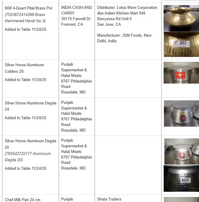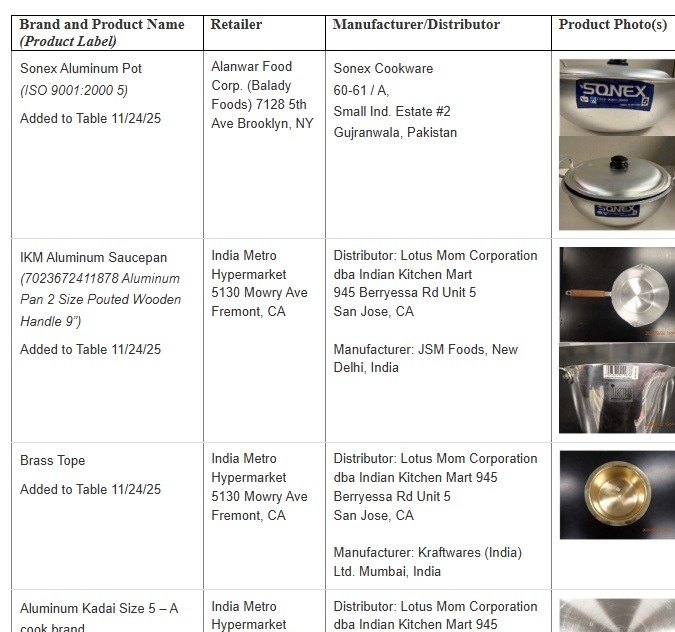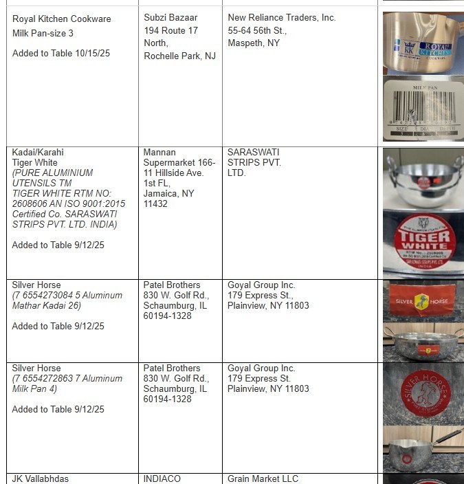 Un reporte de la Administración de Alimentos y Medicamentos (FDA) notificó los lugares donde se vendieron utensilios de cocina calificados como riesgosos para la salud porque podrían filtrar plomo a los alimentos, entre ellos 3 en Nueva York y uno en Nueva Jersey. Específicamente, se trata de ollas Sonex y recipientes para la leche en dos tiendas de Brooklyn, utensilios de cocina en Jamaica y Nueva Jersey.
