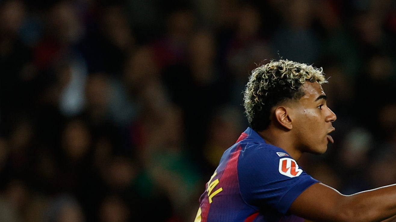 Lamine Yamal del Barcelona hace un gesto durante un partido de fútbol de La Liga española entre el FC Barcelona y el Elche CF en Barcelona, ​​España, el domingo 2 de noviembre de 2025.