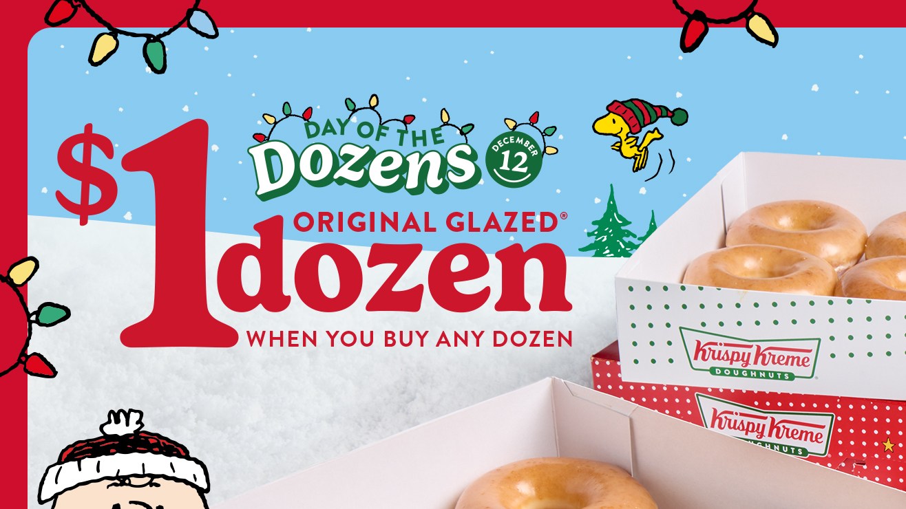 Krispy Kreme ofrecerá una docena de donas por $1 el 12 de diciembre con compra de otra docena. La oferta coincide con su colección navideña inspirada en Peanuts