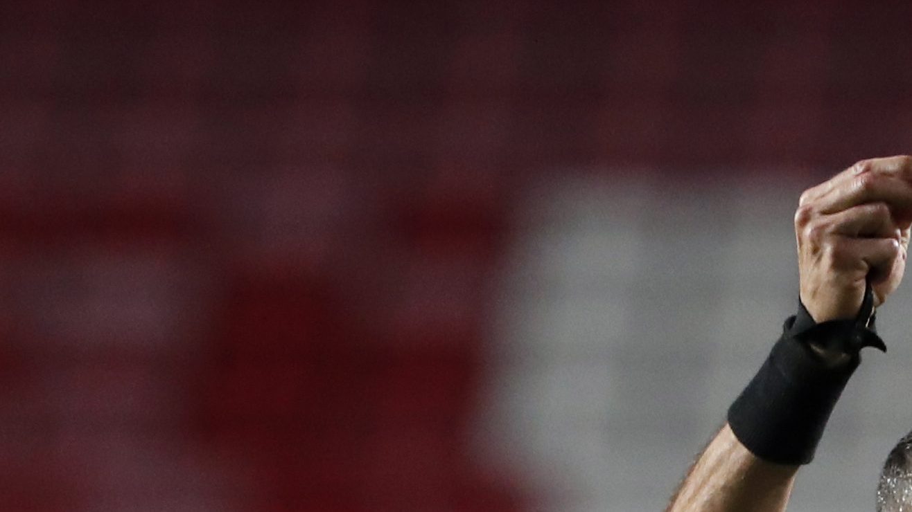 El árbitro Nuno Almeida muestra una tarjeta amarilla durante el partido de fútbol de la Liga Portuguesa entre Benfica y Moreirense en el estadio Luz de Lisboa, el sábado 26 de septiembre de 2020. Crédito: Armando Franca | AP