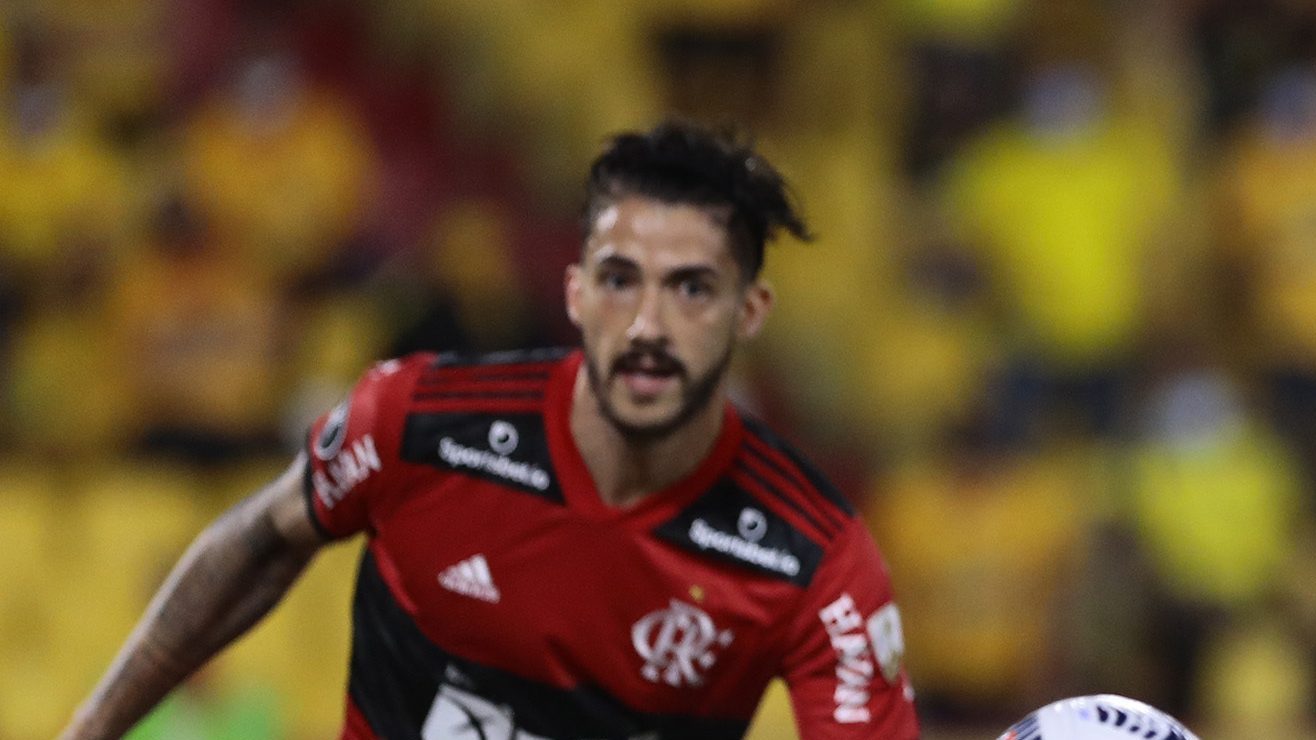 Mario Pineida, del Barcelona de Ecuador, en el centro, controla el balón durante el partido de vuelta de las semifinales de la Copa Libertadores contra el Flamengo de Brasil en el estadio Monumental de Guayaquil, Ecuador, el miércoles 29 de septiembre de 2021. Crédito: Franklin Jacome | AP