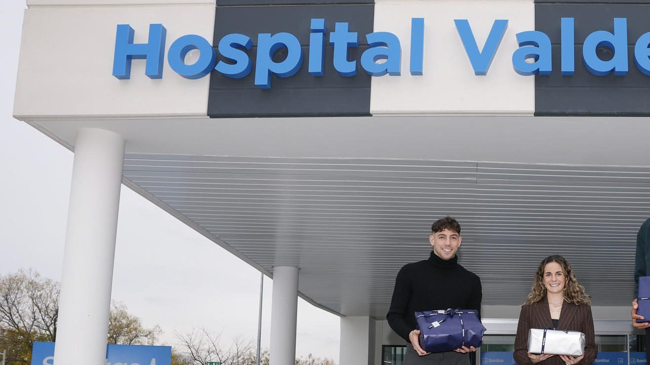 Los jugadores de las diversas secciones del Real Madrid Fede Valverde, Teresa Abelleira y Edy Tavares posan durante su visita de este viernes al Hospital Blua Sanitas Valdebebas, donde han entregado regalos a los niños. Crédito: Real Madrid | EFE