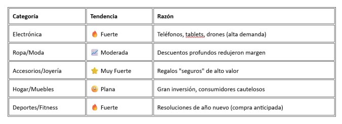 Electrónica, accesorios/joyería y artículos deportes fueron líderes. Ropa tuvo promociones agresivas. Muebles/hogar fue más lento (compra de pensamiento largo).